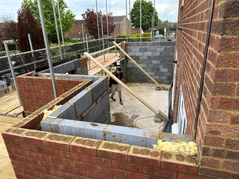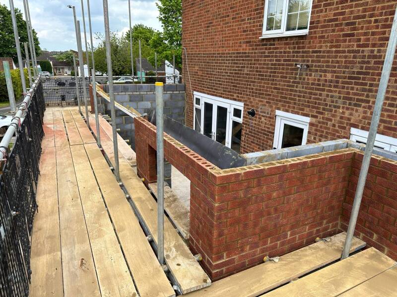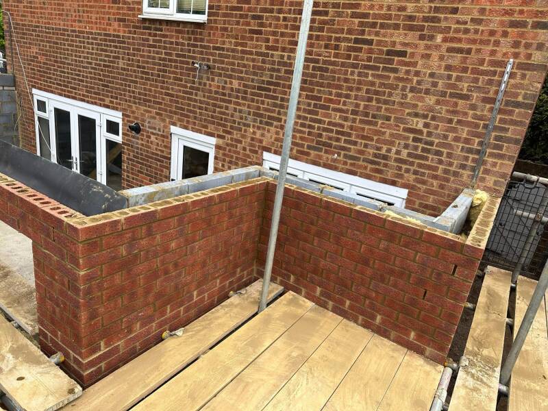 Two storey side and single storey rear extension completed by BBS, pitched roof to the front section with a flat roof and balcony to the rear.